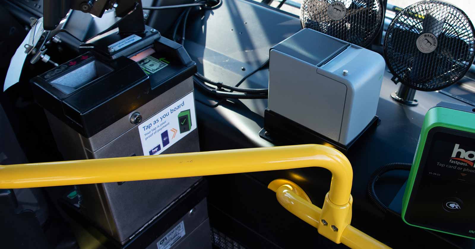 When you board, tell the operator whether you want a 2½-Hour Ticket or a Day Pass, and specify Adult, Honored Citizen or Youth. Insert coins or bills into the farebox (exact change only), then grab your ticket from the printer on the right. Fareboxes accept any combination of bills and coins (including $1 coins). Please note: Bus operators cannot make change.