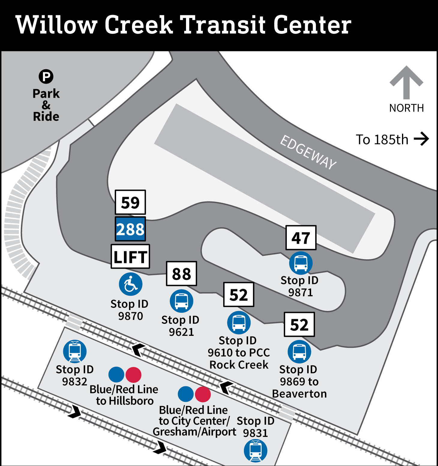 The Willow Creek Transit Center is located west of SW 185th Avenue off SE Edgeway Drive, a short walk north of SW 185th and Baseline.