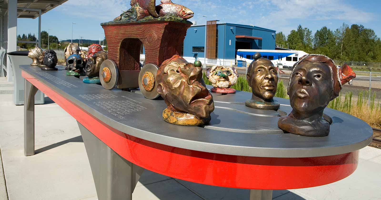 Each station, including the Tigard Transit Center, features a sculptural table with 16 unique bronze heads that express a full range of human experience, from comedy to pathos.