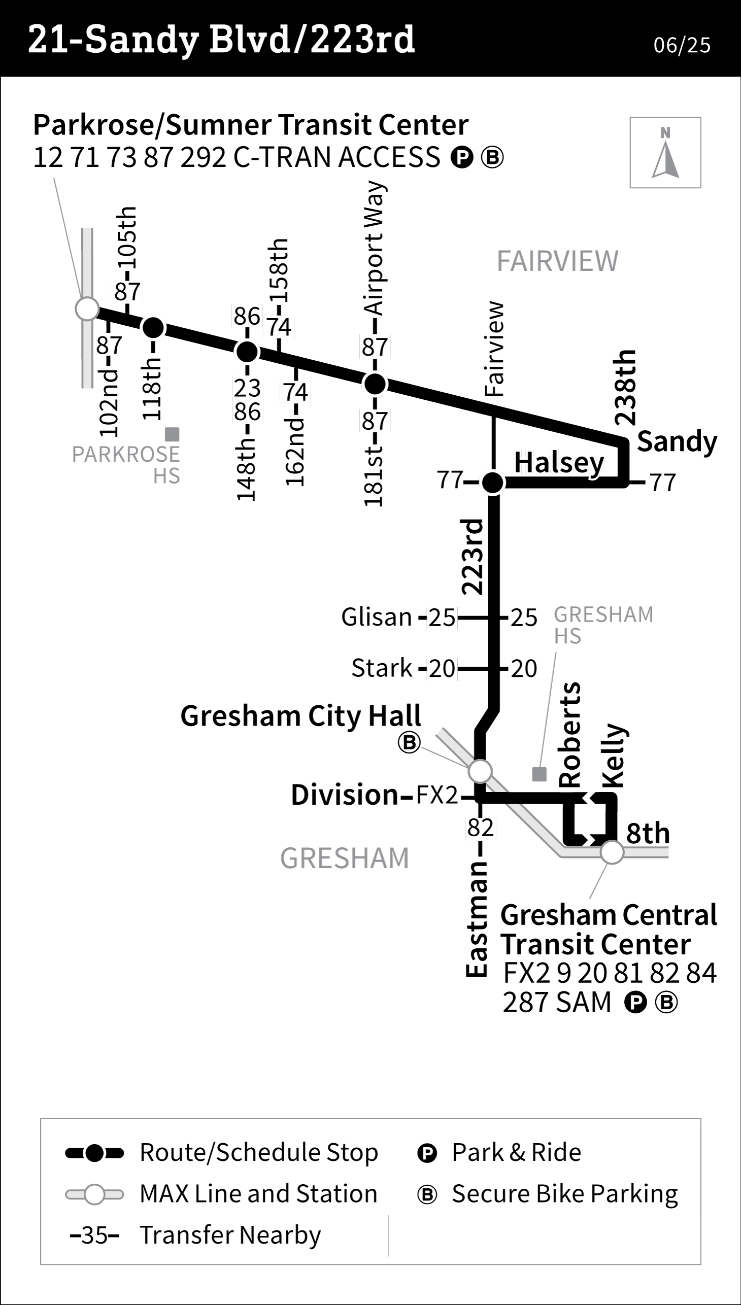 21-Sandy Blvd/223rd connects Parkrose, Fairview and Gresham, via Sandy, 238th, Halsey, 223rd/Fairview and Division.