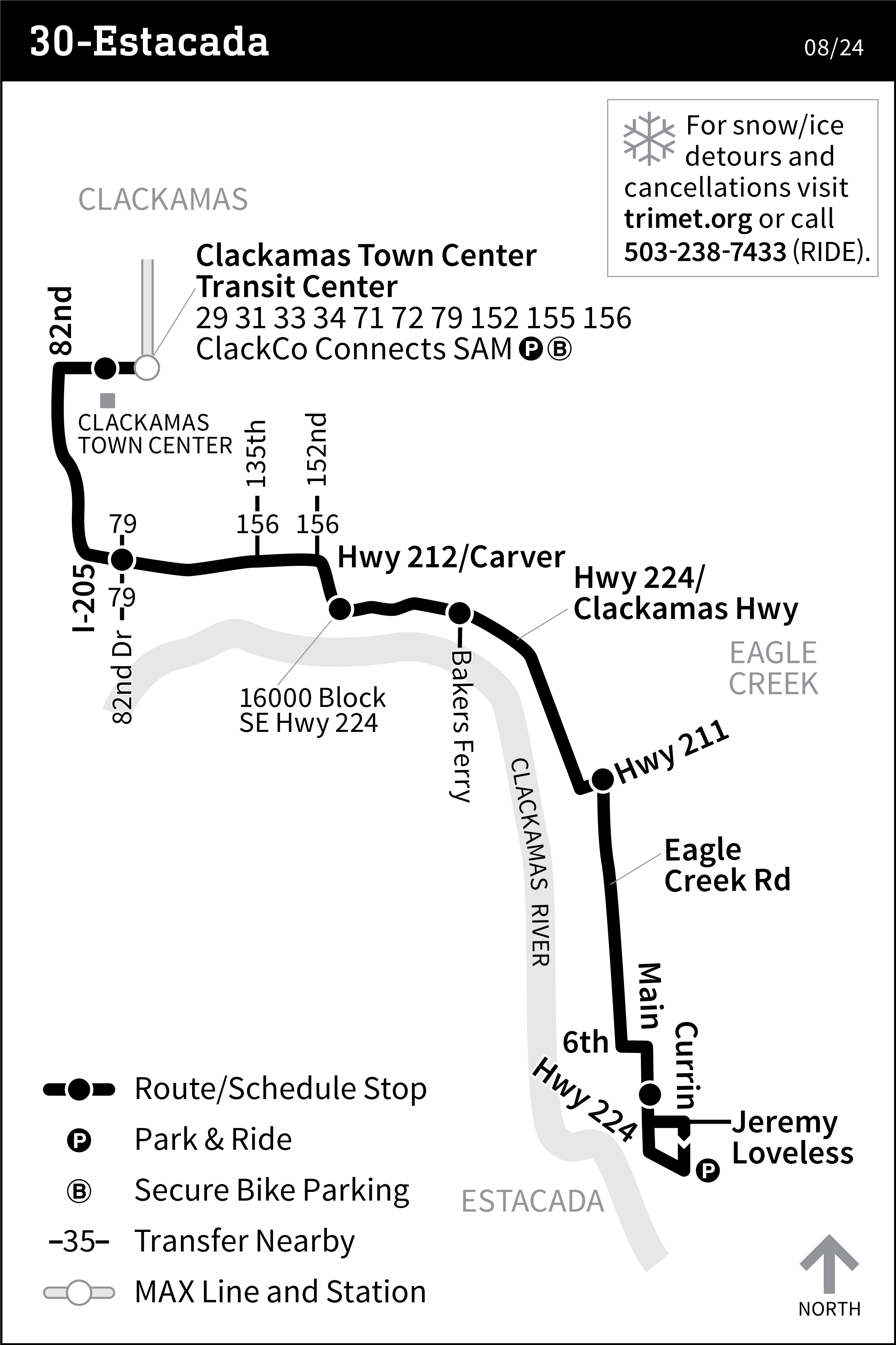 30-Estacada runs between Estacada and Clackamas Town Center, along Eagle Creek Road, Highway 224, Highway 212 and 82nd.