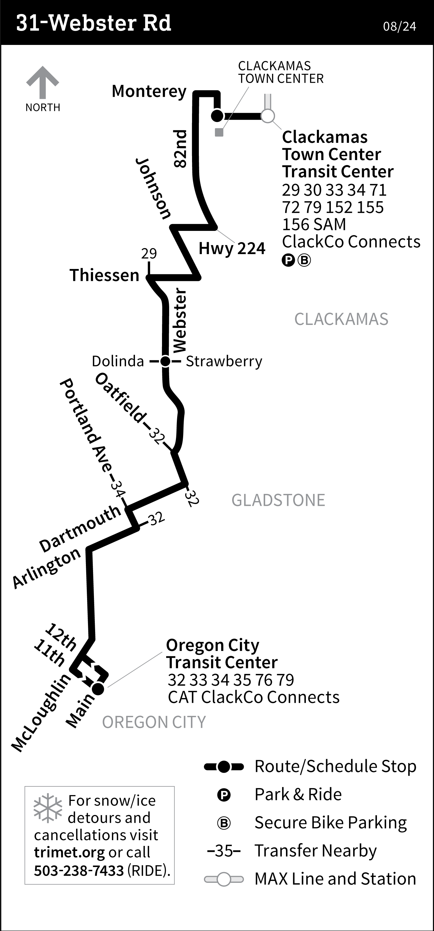 31-Webster Rd connects service between Clackamas Town Center, Gladstone and Oregon City Transit Center along 82nd Ave, Johnson, Thiessen, Webster, Dartmouth, Arlington and McLoughlin.
