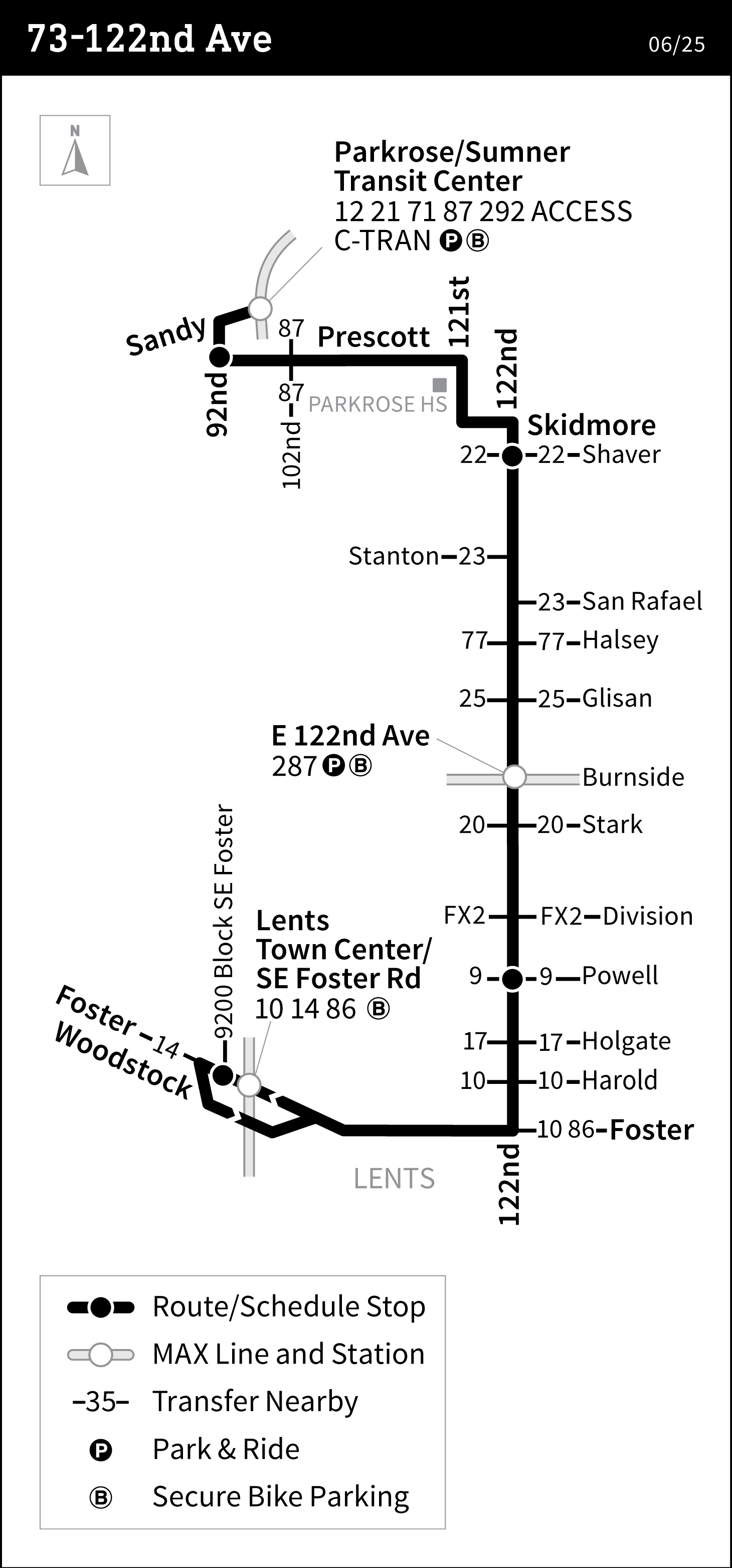 Line 73-122nd Ave runs between Parkrose/Sumner Transit Center and SE 94th & Foster.
